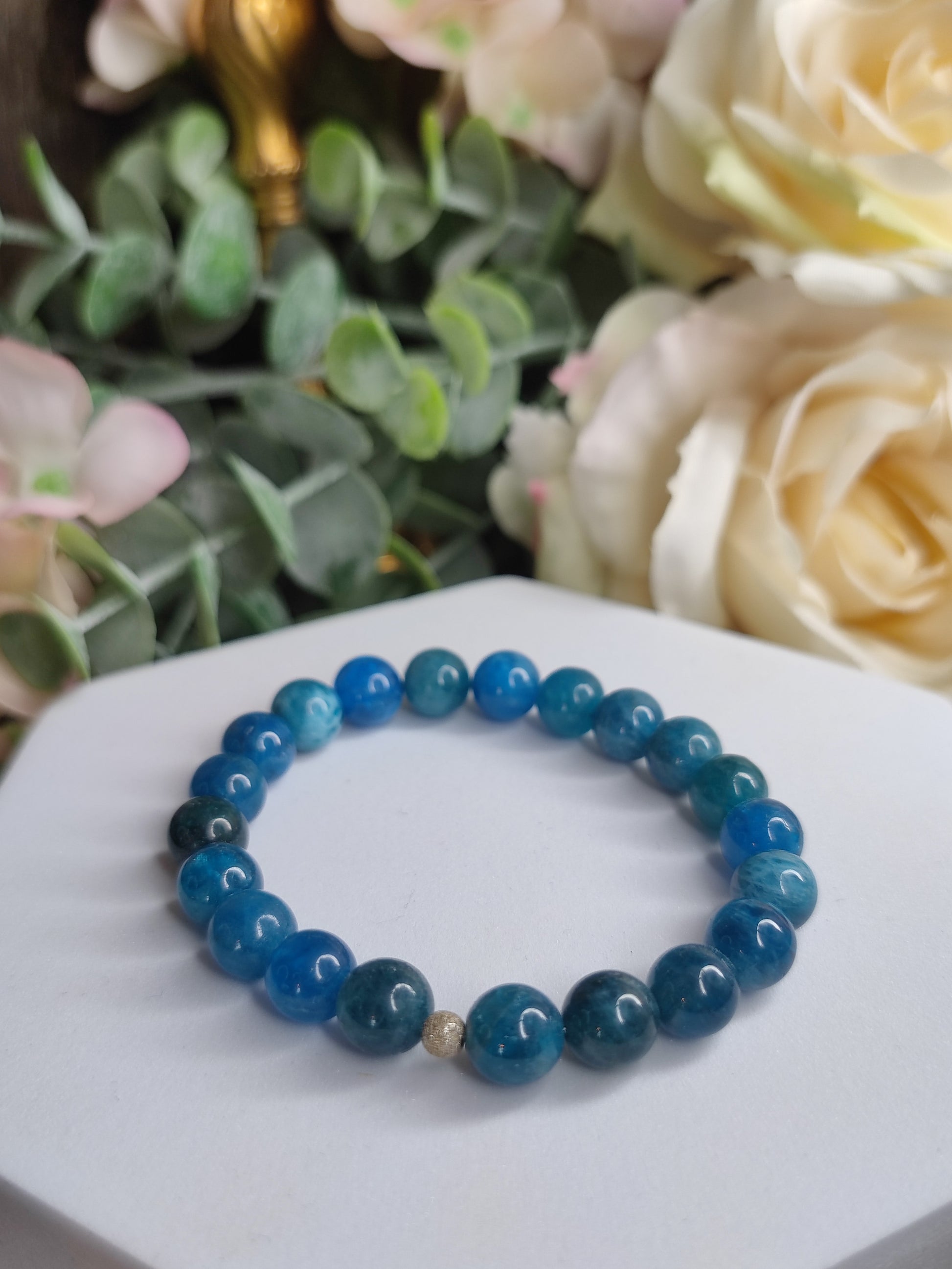 Elastisches Apatit Armband mit 8mm Perlen und diamantierter Sterlingsilberperle