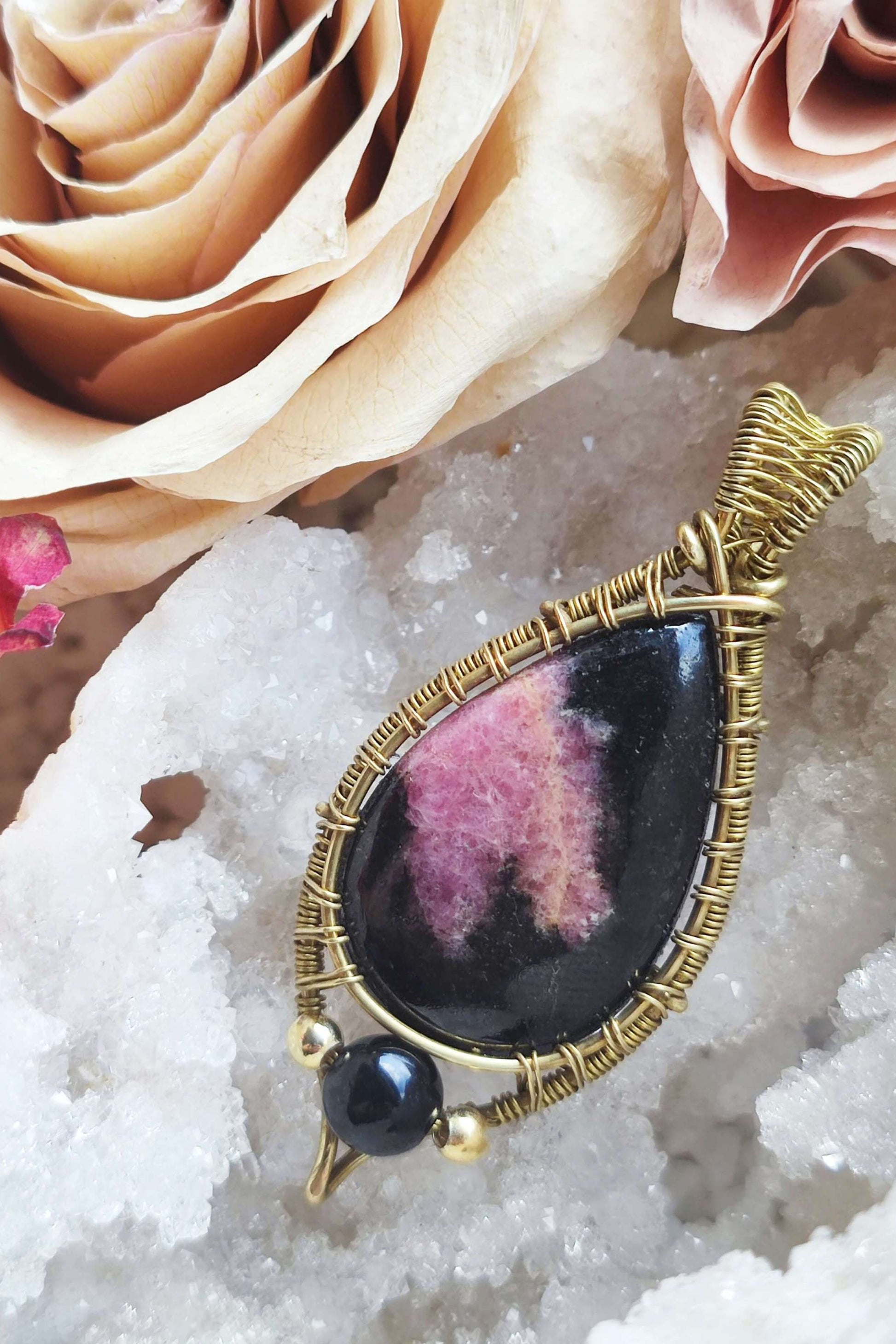 Traumhaft schöner handgefertigter Kettenanhänger aus Messing, Rhodonit Cabochon, Obsidianperle und vergoldeten Sterlingsilberperlen.