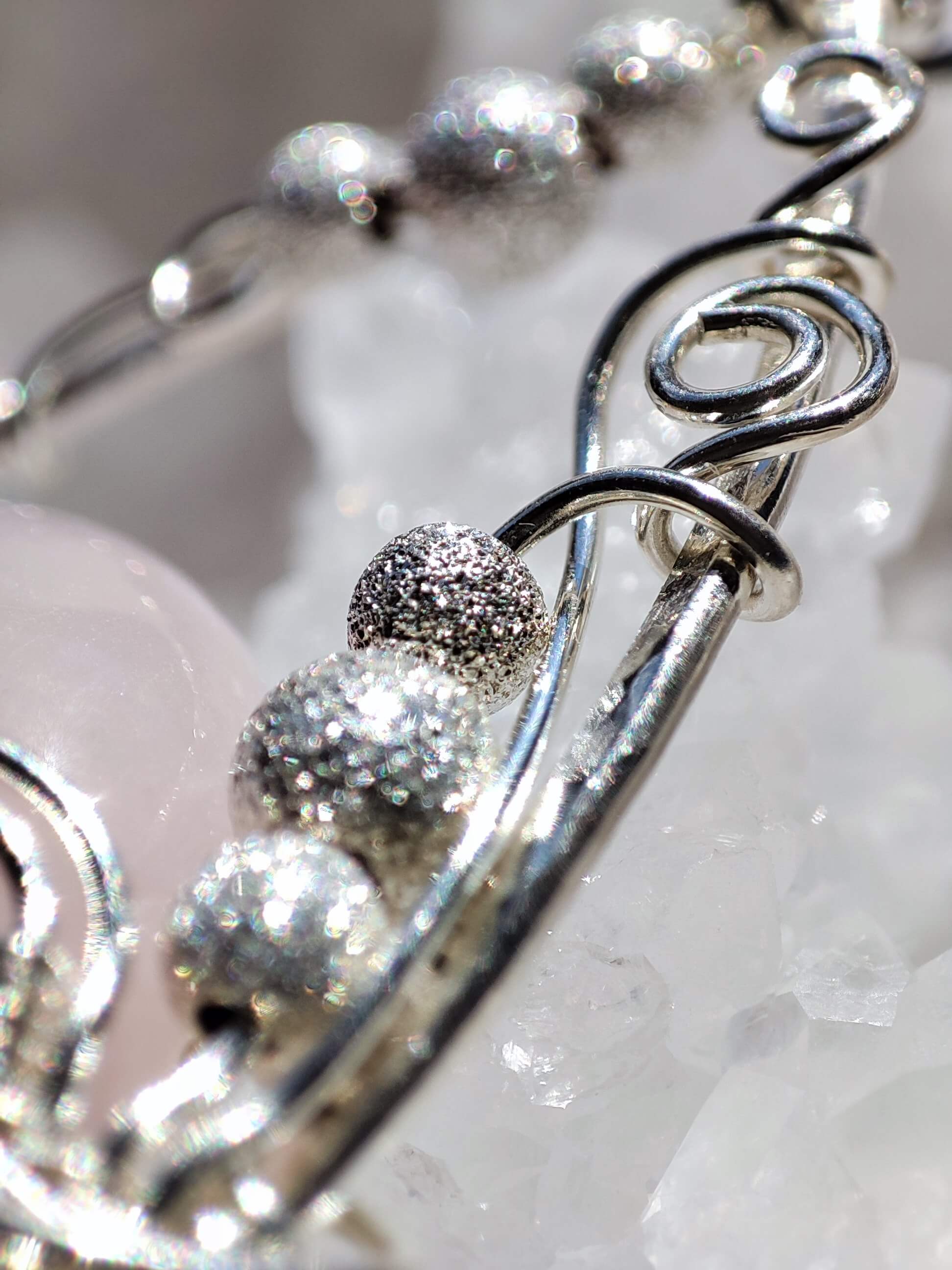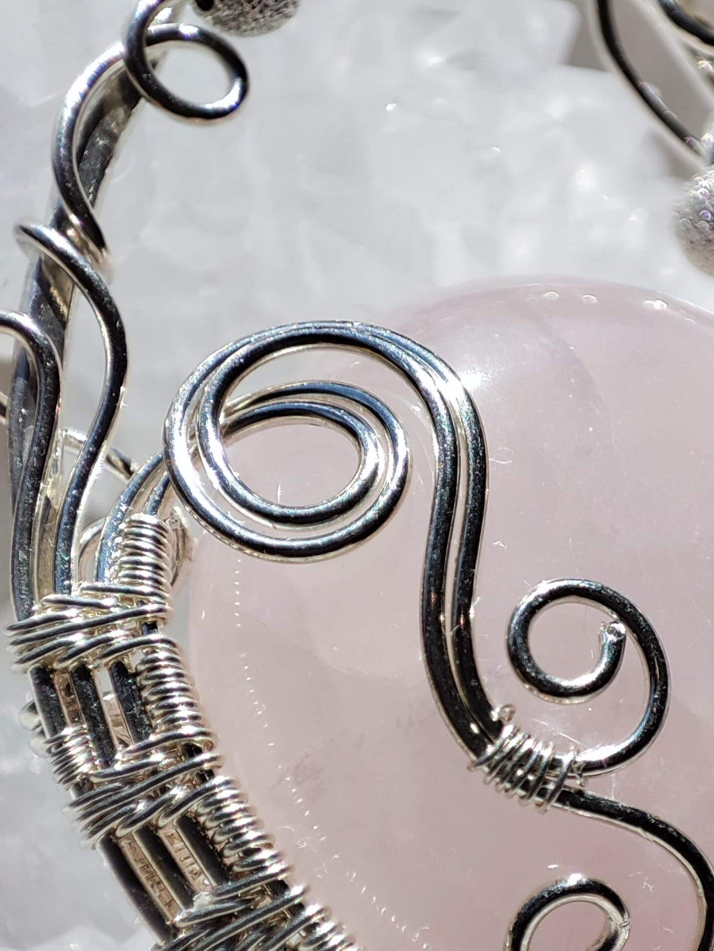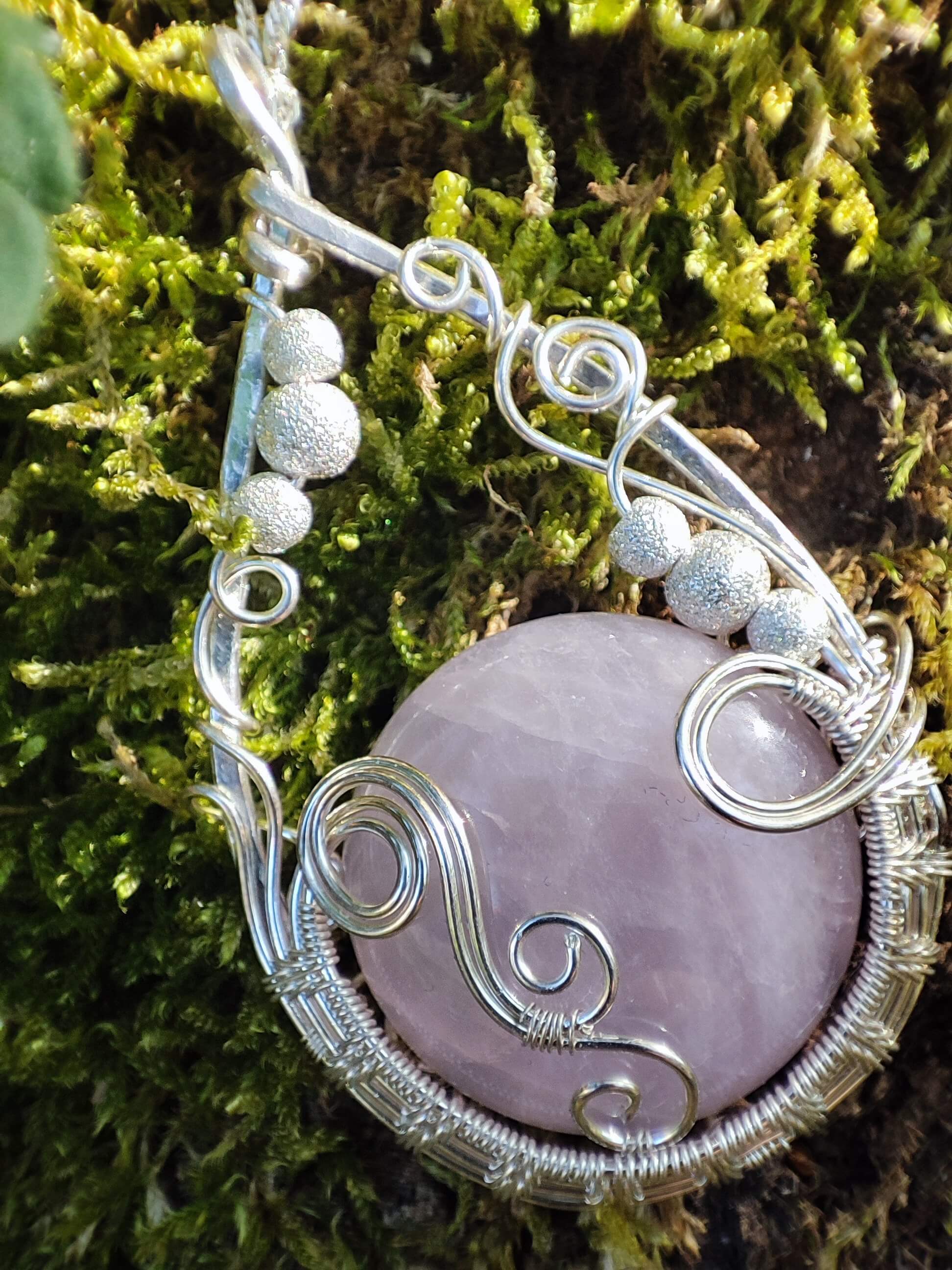Aufwendig handgefertigtes Unikatschmuckstück aus 935 Argentiumsilber, Rosenquarz-Cabochon und diamantierten Sterlingsilberperlen. Stabiler Rahmen gehämmert, mit wunderschönem Weaving im unteren Bereich des Anhängers.