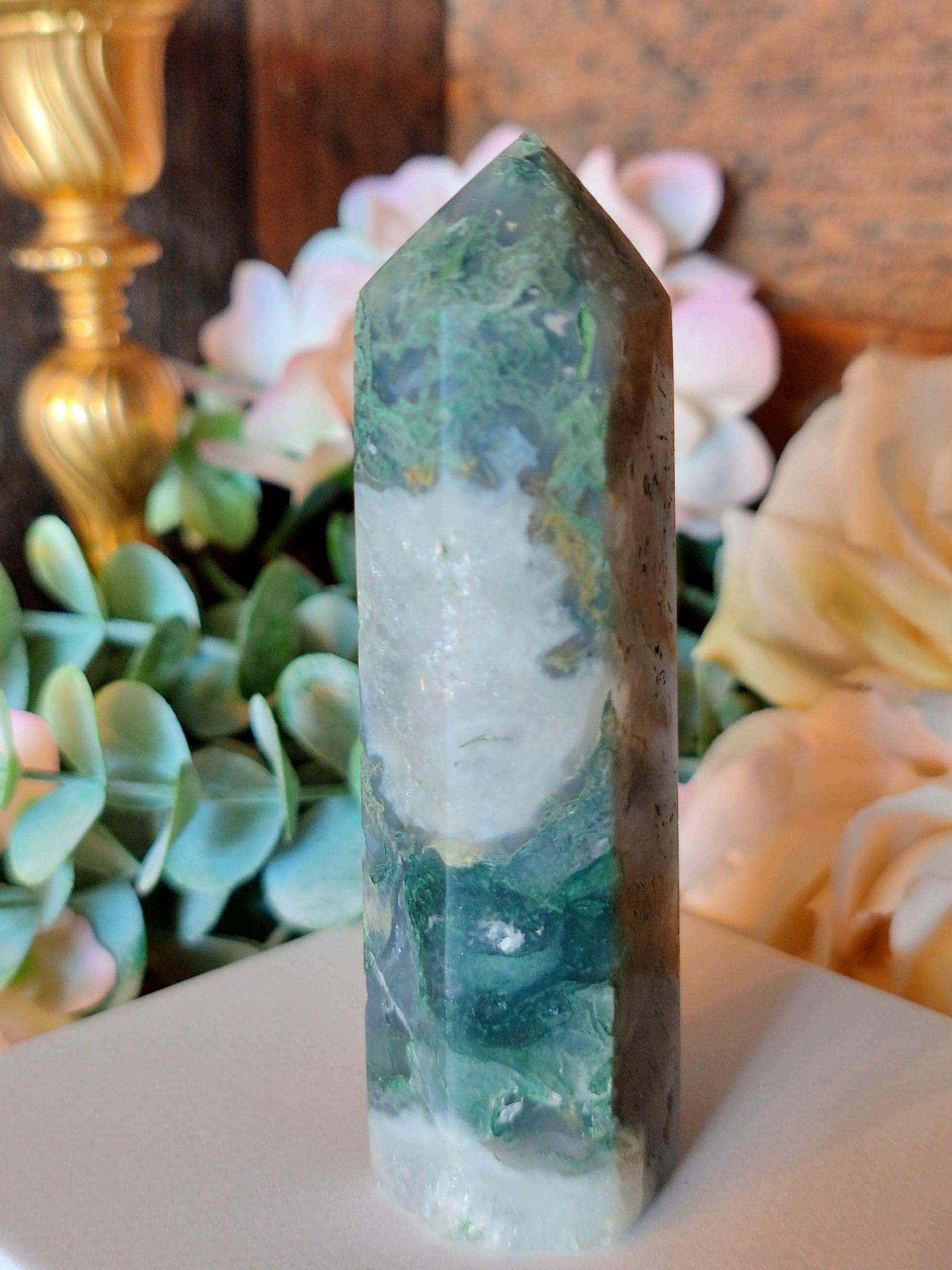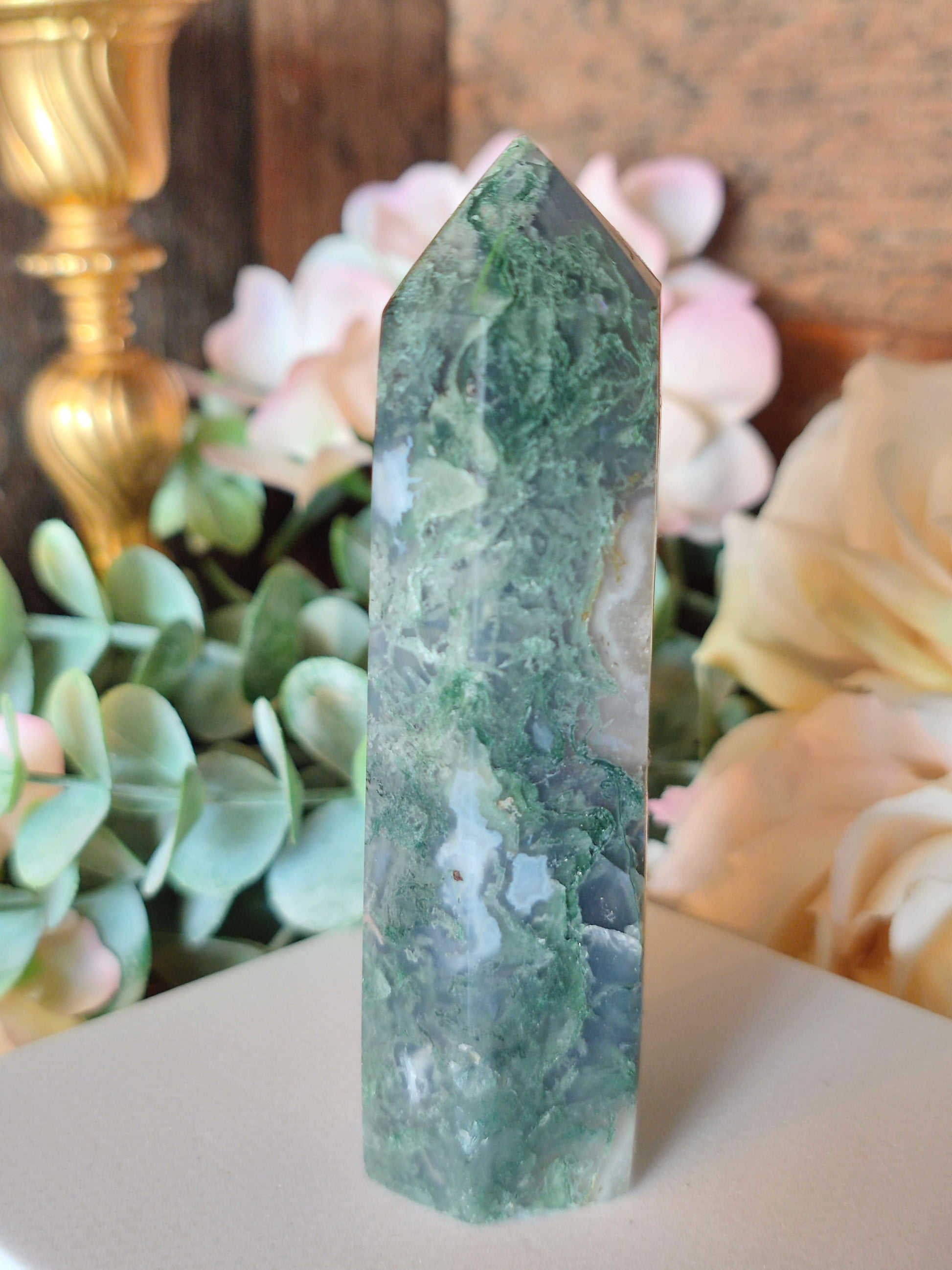 Moosachat - eine Varietät des Chalcedons, deren moosartige, grün-bräunliche Einschlüsse aus Magnesium-Eisen-Silikaten dem Mineral seinen Namen verleihen,