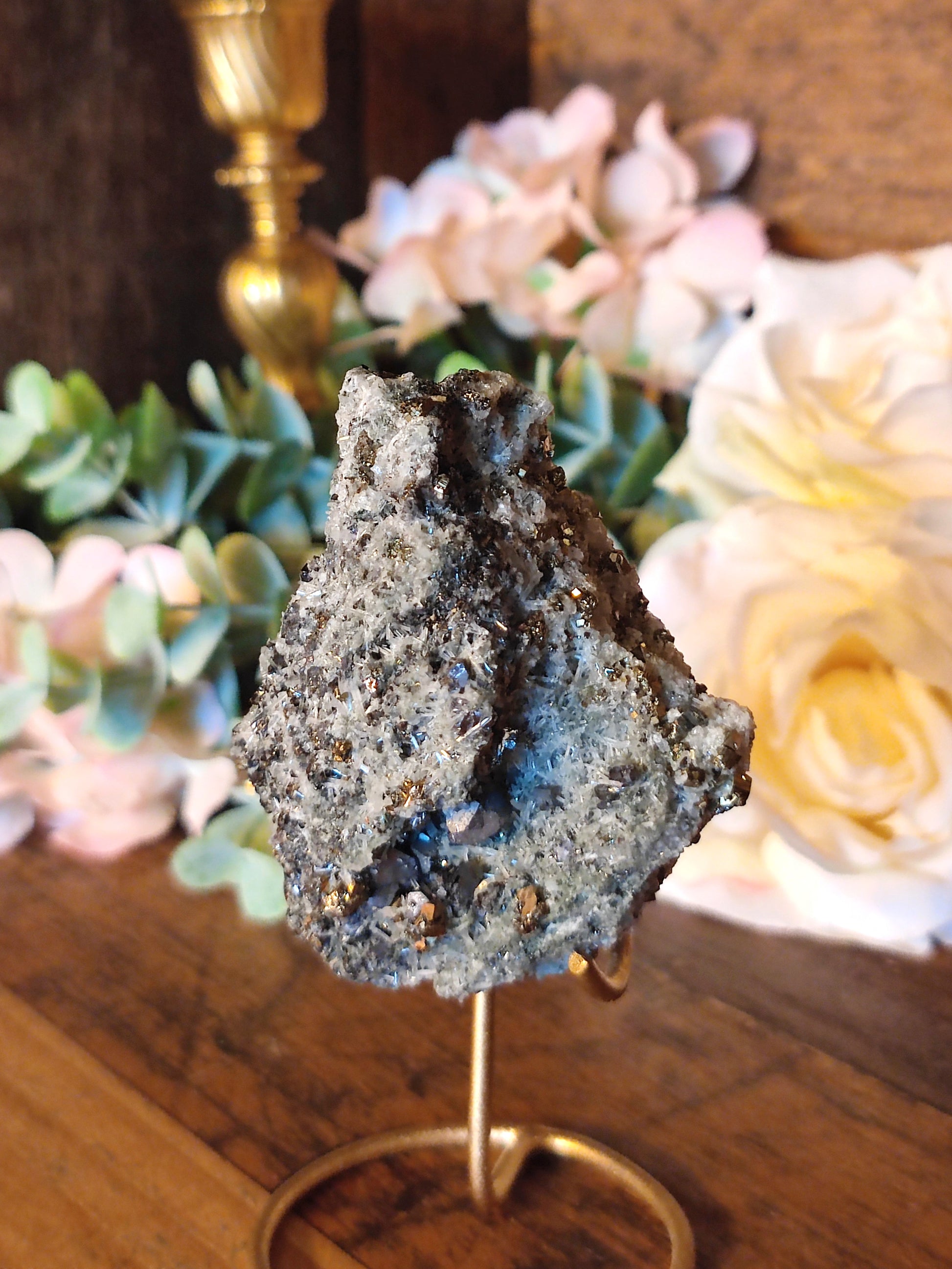 Wunderschön funkelnde Stufe mit feinen Quarznadeln, Galenit und vielen Pyritwüfelchen
